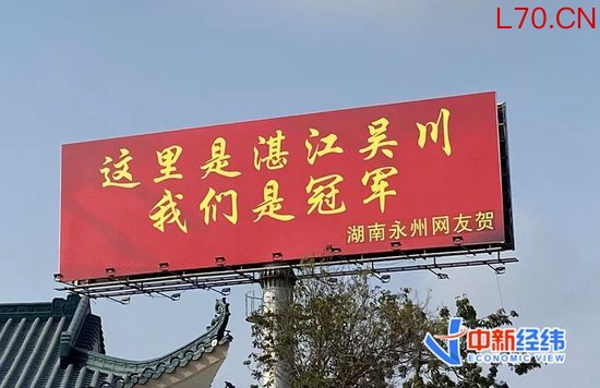 吴川市“大动脉”G228国道丹东线与迎宾路的十字路口,有一处高耸的广告牌,往年常悬挂服装品牌等海报,今年内容更替成红底黄字“这里是湛江吴川,我们是冠军”。