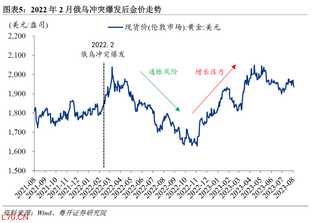 一是短期市场仍将高度关注通胀上升及全球货币紧缩风险,金价可能持续承压。回顾2022年2月俄乌冲突爆发,彼时同样因地缘冲突引发油价大幅上涨、全球通胀压力加剧、美欧央行大幅加息,金价在当年3月触顶后经历了约8个月的下跌,最大跌幅超过20%。直到通胀形势受控,全球经济风险由“胀”转向“滞”、市场关注力由货币紧缩转向货币宽松时,金价才具备反弹基础。