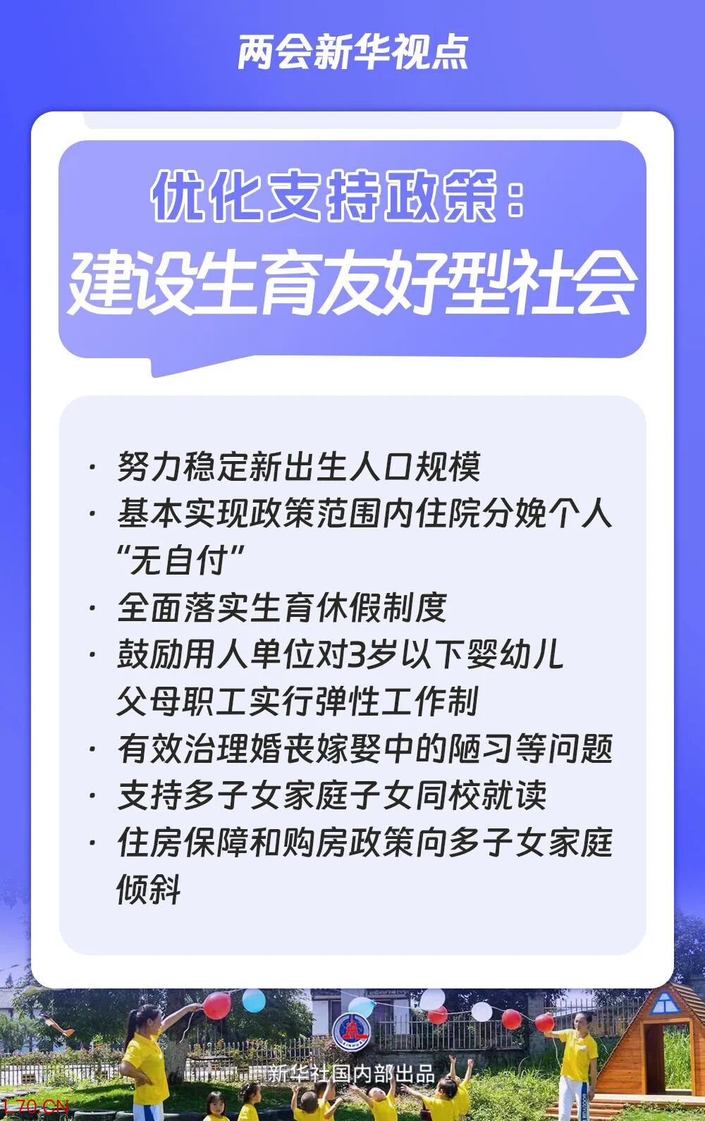 基本实现政策范围内住院分娩个人“无自付”、全面落实生育休假制度、鼓励用人单位对3岁以下婴幼儿父母职工实行弹性工作制、支持多子女家庭子女同校就读、住房保障和购房政策向多子女家庭倾斜……生育支持政策、家庭发展政策和生育友好环境进一步完善。