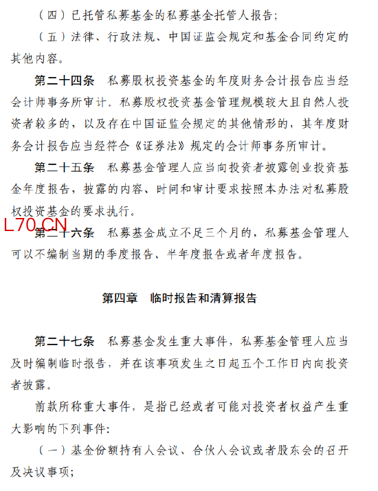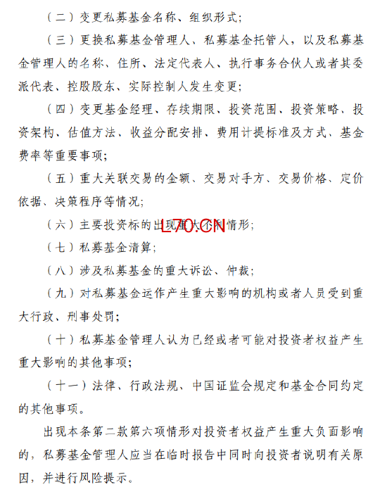 三是规范定期报告、强化临时报告和清算报告。 明确私募证券投资基金和私募股权投资基金的定期报告类型及具体内容。发生重大事件时,管理人应在5个工作日内编制临时报告并向投资者披露。清算公告、清算报告及相关信息也需及时披露。