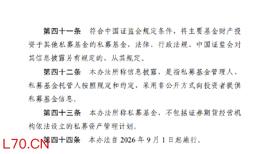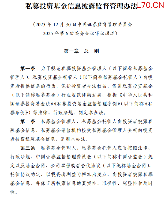 2月27日,中国证监会正式发布《私募投资基金信息披露监督管理办法》(以下简称《办法》),自2026年9月1日起施行。《办法》共七章四十四条,从总则、信息披露基本要求、定期报告、临时报告和清算报告、信息披露事务管理、监督管理和法律责任等方面,对私募基金信息披露活动作出全面规范。