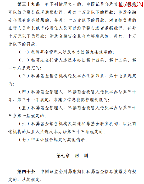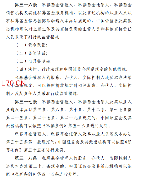 五是明确监督管理和法律责任。 证监会及其派出机构可依法采取责令改正、监管谈话、出具警示函等行政监管措施,并依照《私募条例》对违法行为进行处罚。违反规定的,可处以警告、通报批评及最高二十万元罚款。