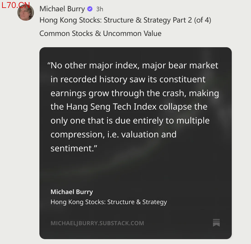 3月12日,迈克尔·巴里公开发文,看多恒生科技。