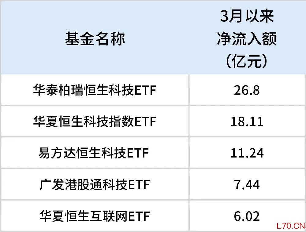 拉长期限看,今年以来,截至3月12日,华泰柏瑞恒生科技ETF净流入142.04亿元,华夏恒生科技指数ETF净流入97.96亿元,易方达中概互联网ETF净流入74.66亿元。此外,易方达恒生科技ETF、天弘恒生科技ETF、华夏恒生互联网ETF净流入均超60亿元。