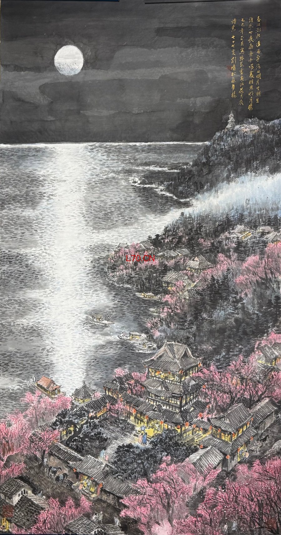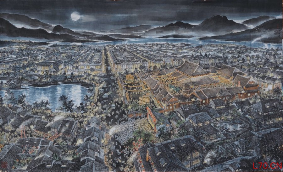 在“人间波澜•笔触不惊”单元,这或许是整个展览最柔软的部分。《龙山寺庆元宵》《春江花月夜》《楼观沧海日,门对浙江潮》……凭借深厚的文学底子,刘墉总在笔墨间藏进诗的意境、散文的肌理、小说的况味。他画童年院子、喧嚣市井、清寂巷弄,画朦胧月色、迷离灯火、暮霭炊烟。每一处细节都流淌着记忆的体温,是人情冷暖,也是世间百态。秉持“可以观、可以游、可以居”的理念,于他而言,绘画是定格景致的空间艺术,是承载岁月的时间艺术,更是安放情怀的归处。