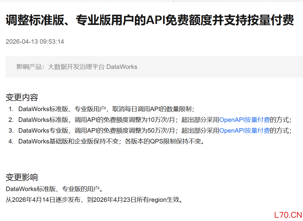 阿里云:调整标准版、专业版用户的 API 免费额度并支持按量付费