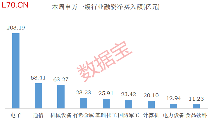 分行业看。电子板块遥遥领先,融资净买入额高达203.19亿元;通信、机械设备板块排在第二、第三名,融资净买入额分别为68.41亿元、63.27亿元。非银金融、煤炭、银行、交通运输融资净偿还额分别为7.32亿元、2.44亿元、1.89亿元、1.26亿元。
