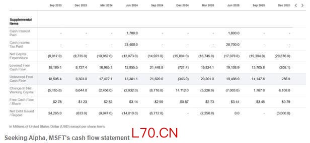 财经分析师Danil Sereda在Q2绩前曾大喊“买入”,乍看之下,这一时机似乎不太走运。从公司季度更新数据来看,微软的资本支出同比激增66%,达到375亿美元,这仅仅是一个季度的投入。若看无杠杆自由现金流水平,公司实际上正消耗掉几乎全部自由现金流。
